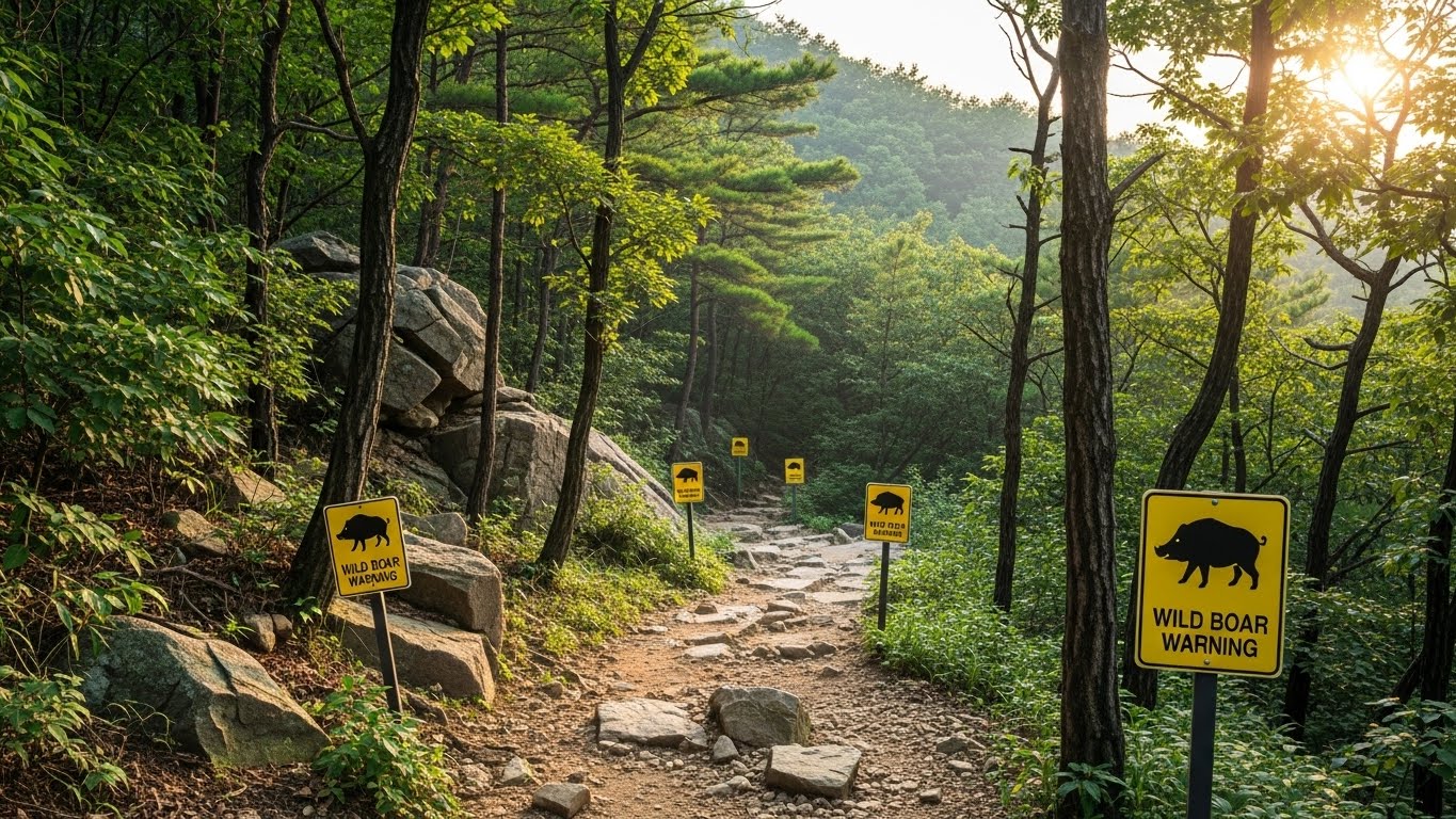 게다가 멧돼지 경고 표지까지 등장한